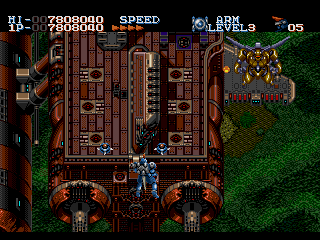 Having secured the gold mine, the Aleste faces Takeda's huge flying fortress. This is another short stage, which is spent entirely fighting the air fortress. The ship is defended by lots of turrets attached to it, as well as flying robots and smaller ships. After most of it is destroyed the frontal part will detach from the rest of the fortress and continue the fight.