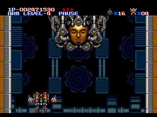 This mid-boss appears as a large golden face in the middle of some sort of machinery. It remains stationery at the top of the screen, releasing gears which move on a circular pattern or vomiting junk, all while the walls constantly open up and close to crush the player.
