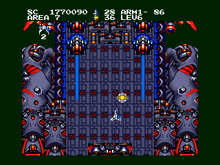 It is finally time for the Aleste 2 to engage the enemy's mothership. The entire stage is spent fighting the mothership's defenses, which include various turrets attached to it, some of which fire lasers which turn 90 degrees when aligned horizontally with the player ship. This stage has no actual boss, as you just fight a series of turrets at the end.