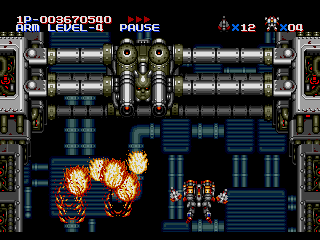 Hainoue appears as a pair of cannons with a face in the middle. It moves horizontally over a pair of metallic tubes, shooting streams of fire from the cannons and shooting bullet spreads at the player. Once the cannons are destroyed it will fire more bullets and faster.